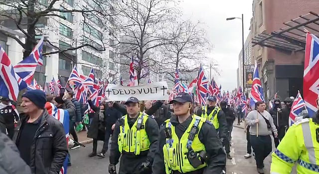 Chants of “send them back” echoed through parts of the city centre as Union Jacks fluttered and protesters voiced anti-immigration slogans and criticism of Prime Minister Keir Starmer.